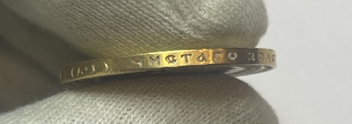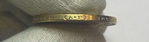 Гурт у монеты гладки, с надписью «ЧИСТАГО ЗОЛОТА 2 ЗОЛОТНИКА 69.36 ДОЛЕЙ (А.Г.)». Согласно международному каталогу гуртов, он имеет №4. На всех сторонах границы рисунка очень четкие.