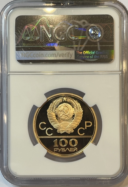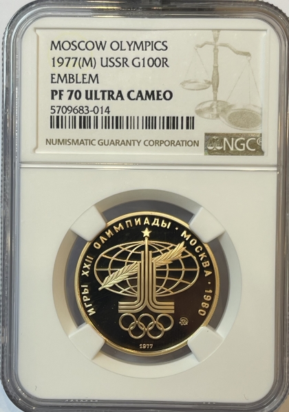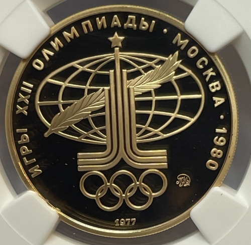 Золотая монета 100 рублей "Аллегория Спорт и Мир" (Эмблема Олимпийских игр 1980г)1977г.ММД в слабе NGC PROOF 70 ULTRA CAMEO