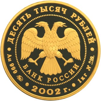 в центре - эмблема Банка России (двуглавый орел с опущенными крыльями, под ним - надпись полукругом "БАНК РОССИИ"), обрамленная кругом из точек и надписями, вверху - номинал: "ДЕСЯТЬ ТЫСЯЧ РУБЛЕЙ", внизу: слева - обозначения драгоценного металла, пробы сплава и товарный знак монетного двора, в центре - год выпуска "2002 г.", справа – содержание химически чистого металла и порядковый номер монеты №___.