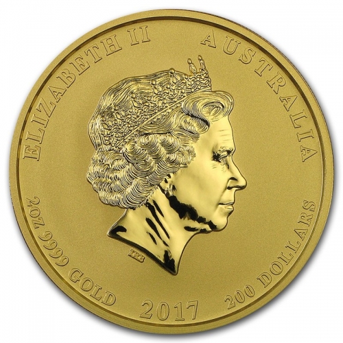 • На аверсе золотой монеты Австралии "Лунный календарь 2 - Год Петуха" - профиль королевы Великобритании Елизаветы II. Сверху надписи на английском: "Elizabeth II" и "Australia". Снизу - проба золота и вес монеты (1 тройская унция золота 9999 пробы), год выпуска монеты (2017) и номинал монеты (100 австралийских долларов).