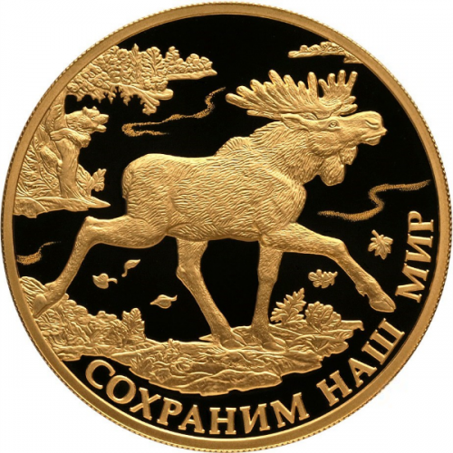 на зеркальном поле диска – рельефное изображение бегущего лося на фоне лесного пейзажа, внизу и справа вдоль канта – надпись: "СОХРАНИМ НАШ МИР".