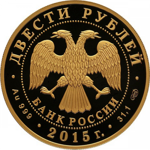 в центре – эмблема Банка России (двуглавый орёл с опущенными крыльями, под ним – надпись полукругом "БАНК РОССИИ"), обрамленная кругом из точек и надписями по кругу – вверху: "ДВЕСТИ РУБЛЕЙ", внизу: слева – обозначения драгоценного металла и пробы сплава, в центре – дата выпуска "2015 г.", справа – содержание химически чистого металла и товарный знак монетного двора.