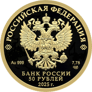 рельефное изображение Государственного герба Российской Федерации, над ним вдоль канта – надпись полукругом «РОССИЙСКАЯ ФЕДЕРАЦИЯ», обрамленная с обеих сторон сдвоенными ромбами, под гербом слева – обозначения драгоценного металла и пробы сплава, справа – содержание химически чистого металла и товарный знак монетного двора, внизу в центре в три строки – надпись «БАНК РОССИИ», номинал монеты «50 РУБЛЕЙ», год выпуска «2025 г.».