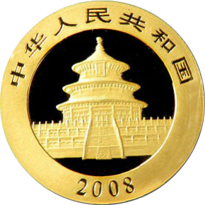 • Аверс: в центре монеты Китайская Панда изображение Небесного Храма, сверху надпись, которая переводится как Китайская Народная Республика, внизу год выпуска. Если выпуск посвящен памятной дате, то тематика указана именно в этом месте.