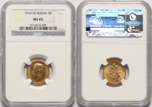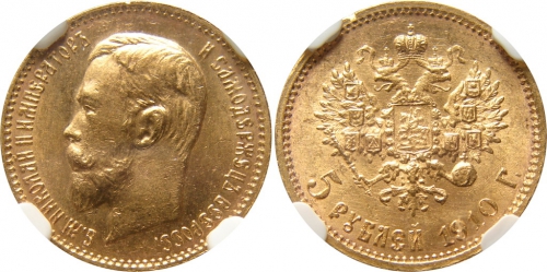 Золотая монета Николая II 5 рублей 1910 год состояние MS 65