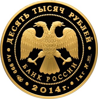 в центре - эмблема Банка России (двуглавый орел с опущенными крыльями, под ним - надпись полукругом "БАНК РОССИИ"), обрамленная кругом из точек и надписями, вверху - номинал: "ДЕСЯТЬ ТЫСЯЧ РУБЛЕЙ", внизу: слева - обозначения драгоценного металла, пробы сплава и товарный знак монетного двора, в центре - год выпуска "2014 г.", справа – содержание химически чистого металла и порядковый номер монеты №s__.