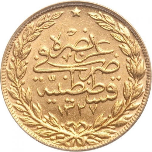 Золотая монета Турции "100 курушей Мухаммеда V Решада", 6.6 г чистого золота (Проба 0,917)