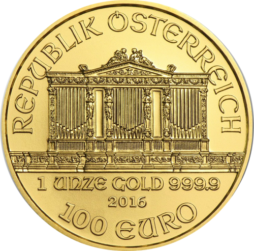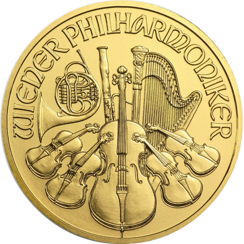 Венская филармония – золотая монета 99,99-процентной пробы (0,9999). При диаметре в 37 мм монета весом в одну унцию является самой крупной среди всех золотых монет мира. Выпускается четыре монеты разного веса с одним и тем же оформлением. До введения евро в 2002 году номинал золотой монеты обозначался в австрийских шиллингах. Номинал монеты носит символический характер. Стоимость монеты определяется дневными ценами на золото на Нью-йоркской товарной бирже или Лондонской бирже металлов.